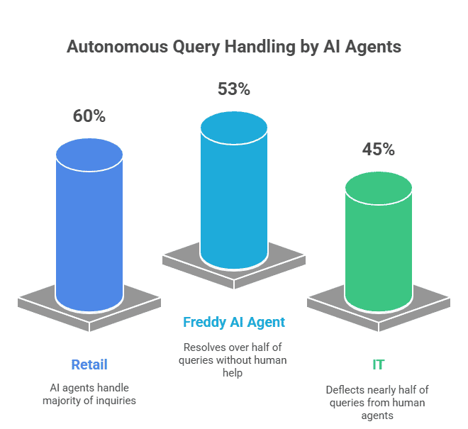 - Retail companies using Freddy AI Agent report 53% of all incoming queries resolved without human intervention