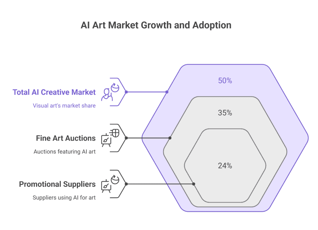 - 24% of promotional suppliers use AI for artwork creation, demonstrating significant adoption in commercial applications (ASI, 2025)