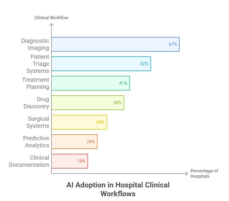 According to Deloitte Health Research, clinical deployment has spread across virtually every department, with some areas seeing faster adoption than others.