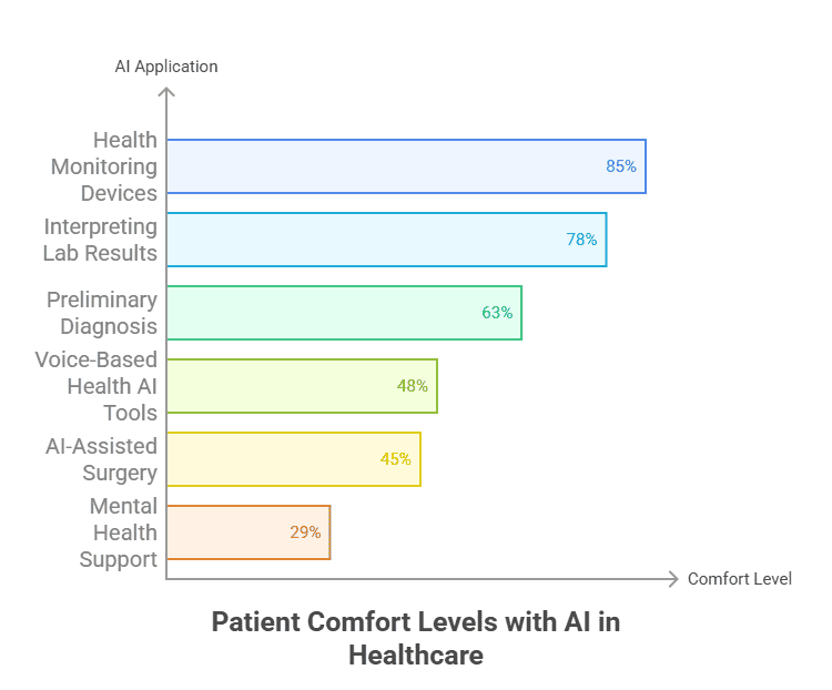 Here’s what this tells us: patients readily embrace AI as a behind-the-scenes helper but hesitate when it touches the human elements of care. They want AI to handle the data, not replace their doctor’s bedside manner.
