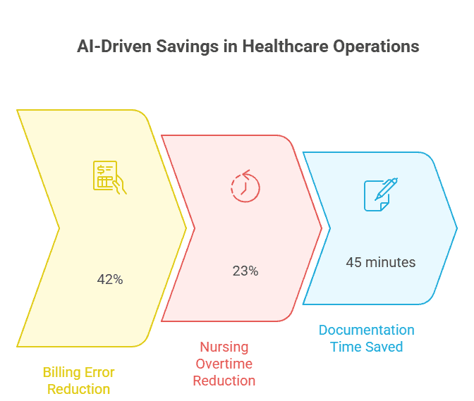 Administrative operations are seeing the biggest financial wins. Healthcare systems report a 42% reduction in billing errors after implementing AI-powered revenue cycle management. That translates to real money – hospitals averaging 50,000 patient encounters annually save roughly $2.1 million in billing corrections and reprocessing costs.