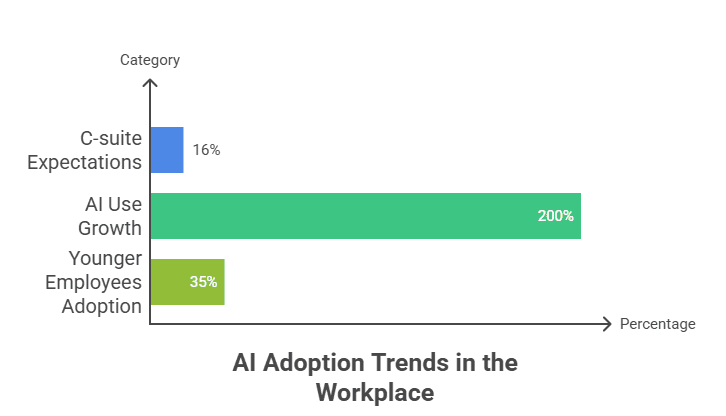 Generational patterns are clear too. Younger employees under 35 are adopting AI at significantly higher rates than their older colleagues. They’re not just using it occasionally – they’re integrating AI into their daily workflow naturally.