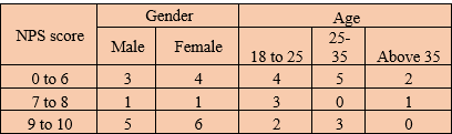 For instance, for a survey of 20 customers, the gender and age-wise categorization of NPS may look like: