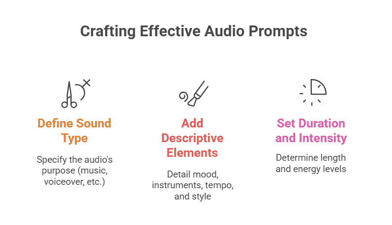 Audio prompts work differently from text or image prompts. You’re describing what something should sound like, not what it should look like. Your prompt needs to capture tempo, tone, instruments, emotional quality, and duration.