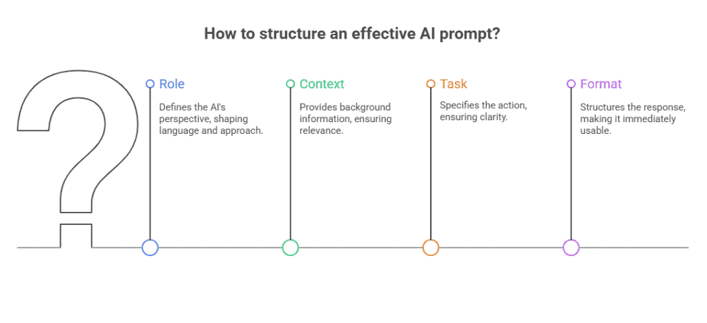 The University System of Georgia’s AI Literacy Guide breaks down effective prompts into four elements: Role, Context, Task, and Format. Think of these as the building blocks that transform vague requests into specific instructions.
