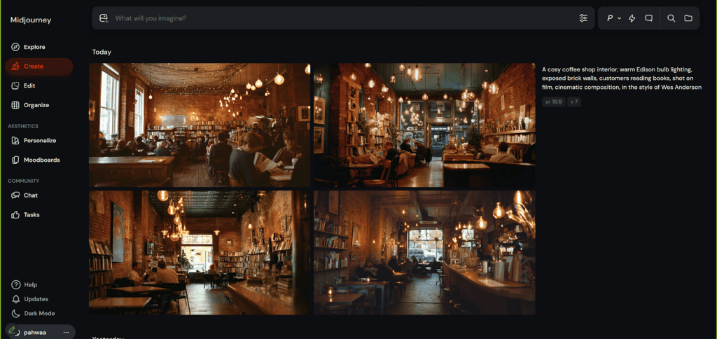 Prompt: “A cosy coffee shop interior, warm Edison bulb lighting, exposed brick walls, customers reading books, shot on film, cinematic composition, in the style of Wes Anderson –ar 16:9 –v 7”