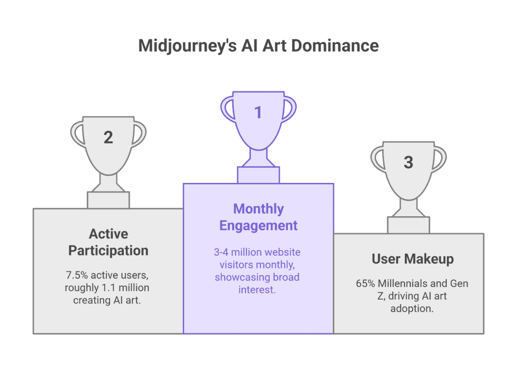 - Monthly engagement: 3-4 million website visitors hit Midjourney’s site each month