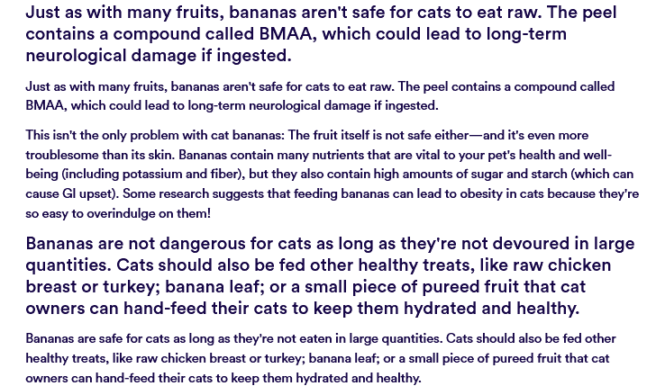 - Stating that bananas are good for a cat's coat and skin and then saying it can upset a cat's GI and cause obesity.