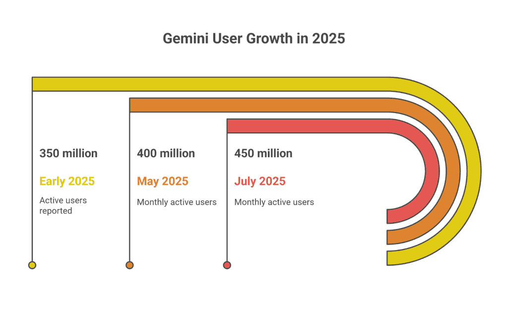 Gemini crossed 450 million monthly active users by July 2025. Daily usage has grown quickly, showing that people are not just testing the tool but using it often.