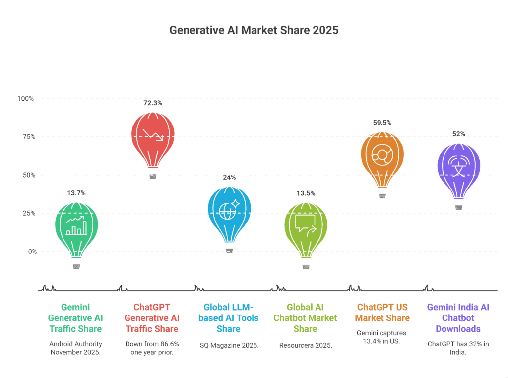 The shift here is clear: the market is spreading out. ChatGPT is still ahead, but people now have options. In India and other mobile-first regions, Gemini is the first choice because it already comes with Android devices.