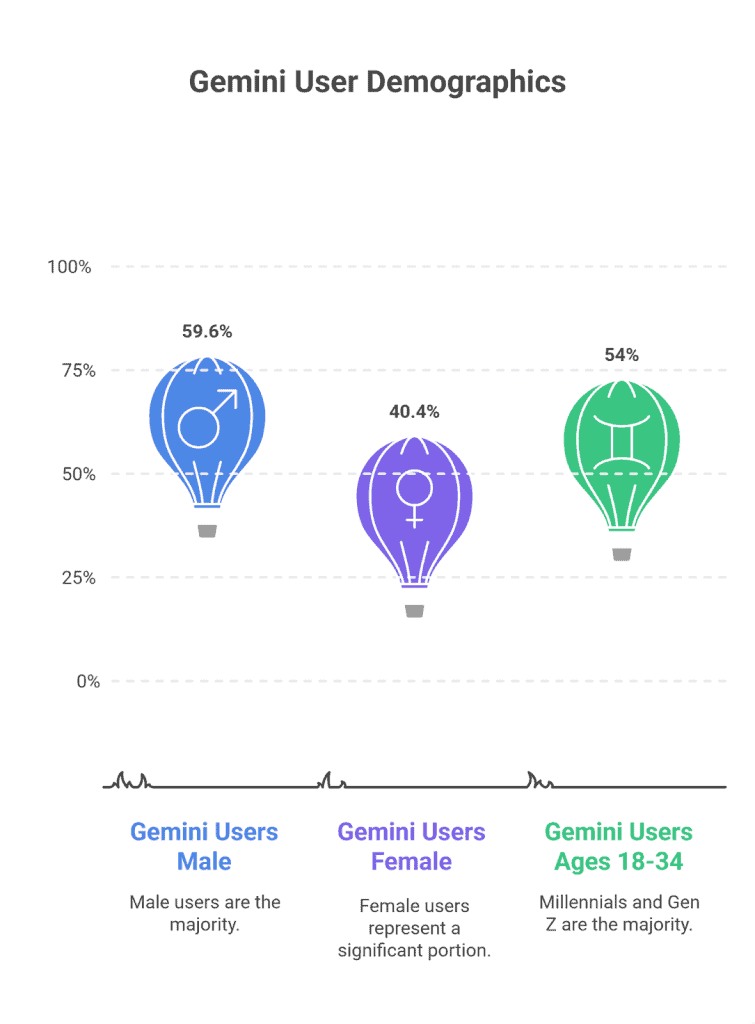 - 59.6% of Gemini users are male, and 40.4% are female.