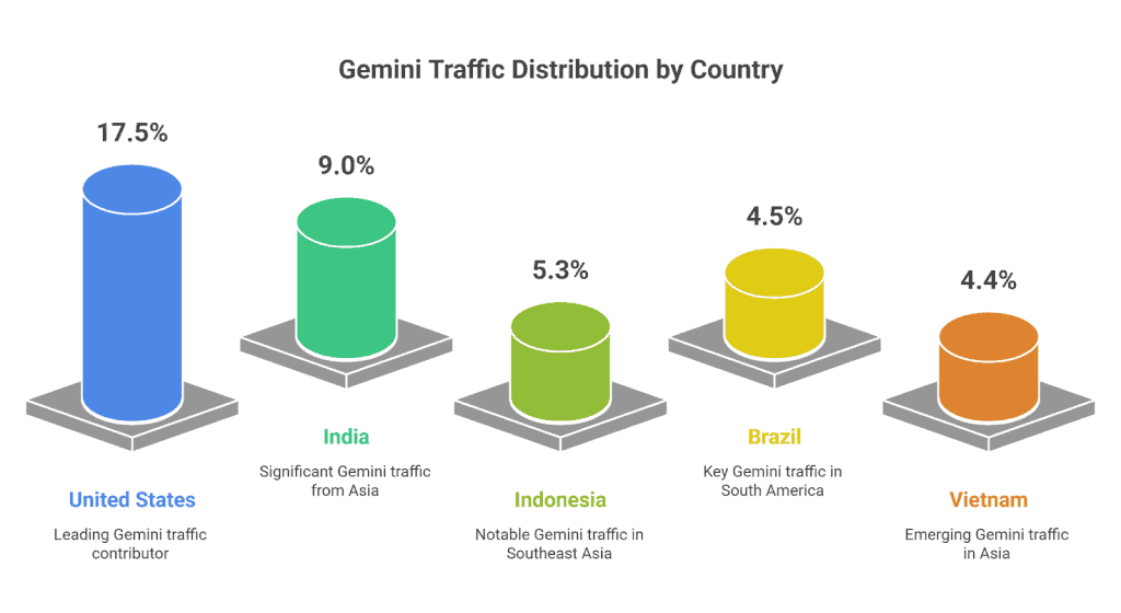 Gemini’s traffic comes from many parts of the world. This widespread is important because it shows the tool is not limited to only one type of user or one economy.