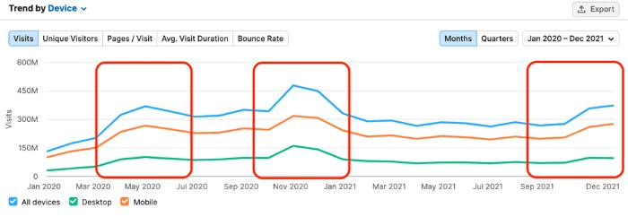 The visual graph below shows the traffic data accumulated through mobile, desktop and all devices with the help of a line graph.