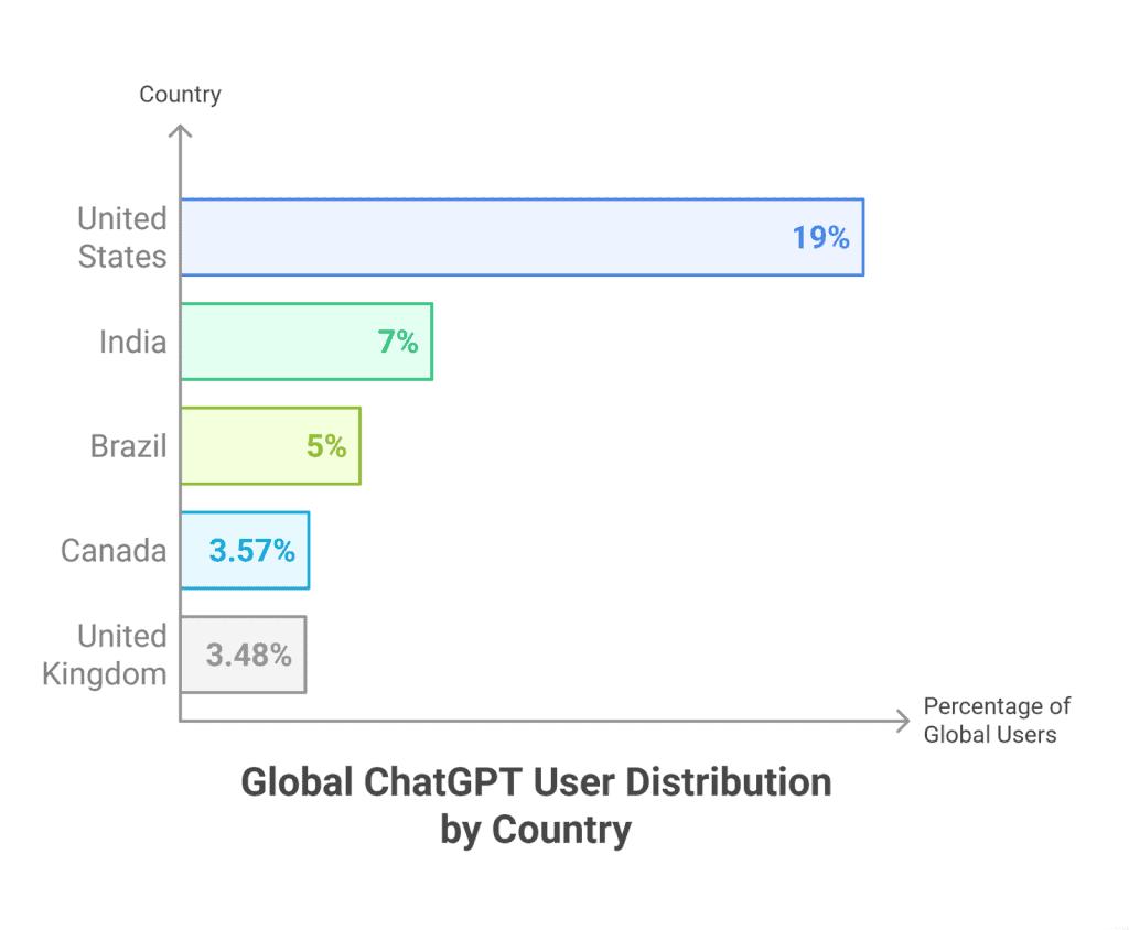 The United States clearly dominates with nearly one-fifth of all users, showing strong early adoption in tech-forward markets.