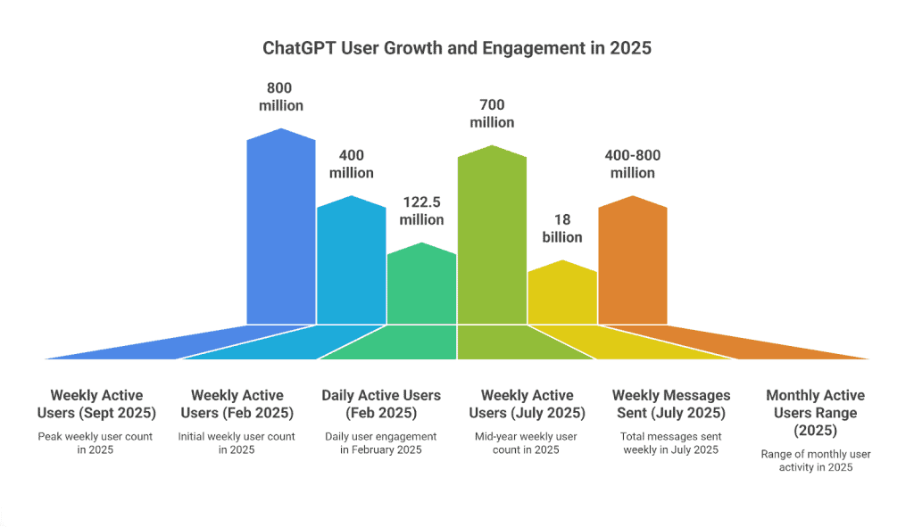 - ChatGPT reached 800 million weekly active users by September 2025, from 400 million users in February 2025