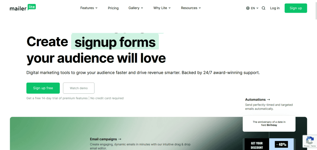 MailerLite combines traditional email marketing with modern AI features. It’s a complete email marketing platform that now includes AI email generation tools built right into the system.