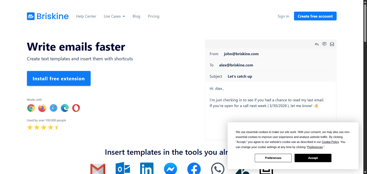Briskine is a browser extension that turns repetitive email writing into a simple keyboard tap, saving you hours each week on customer support, sales follow-ups, and daily communication.