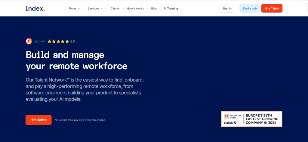 - Best for risk-free hiring: Index.dev– Companies wanting quick matching with trial periods and legal handled.