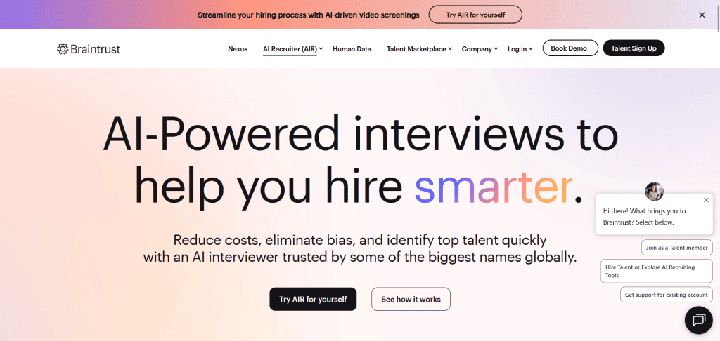 - Braintrust AIR conducts initial candidate screening and interviews automatically