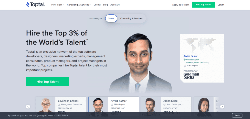 Toptal connects you with the top 3% of freelance developers worldwide. The platform’s rigorous screening process filters out all but the most skilled professionals. These developers typically come from leading tech companies like Google, Apple, and Amazon.
