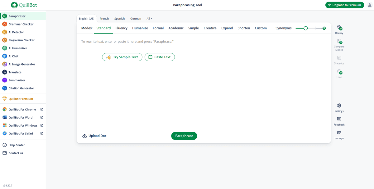 Paraphrasing Modes | Multiple modes, including Standard, Fluency, Formal, Simple, and Creative |
