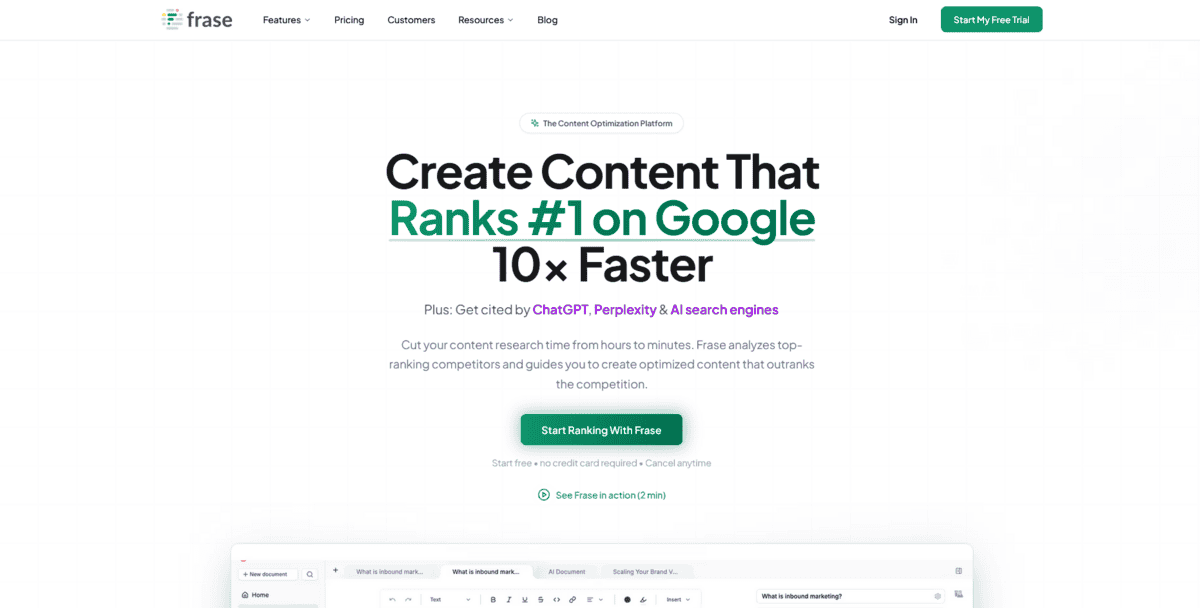 - Frase optimizes content for both traditional search engines like Google and AI platforms like ChatGPT and Perplexity
