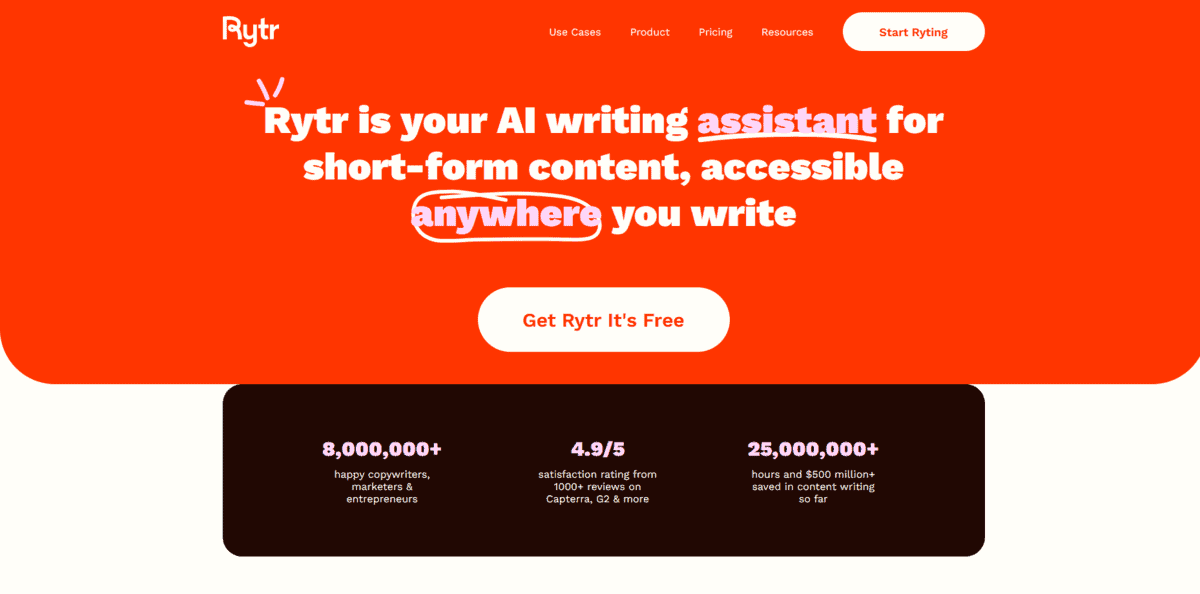 Rytr uses GPT-3 technology to generate content quickly, and according to user reviews, it offers different pricing tiers, including a free plan with basic features. This makes it accessible if you’re just starting out or testing AI writing tools.