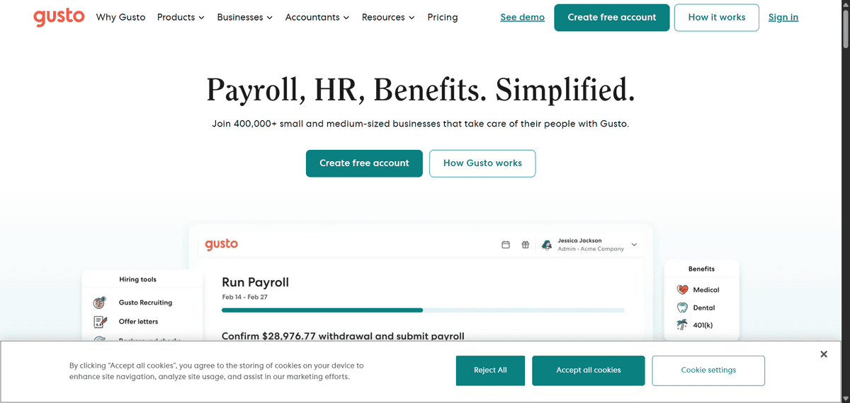 Gusto is a payroll, benefits, and HR platform built for small businesses and startups. It handles the entire payroll process including tax calculations, filings, and employee onboarding. The interface is straightforward enough to use without dedicated HR expertise.