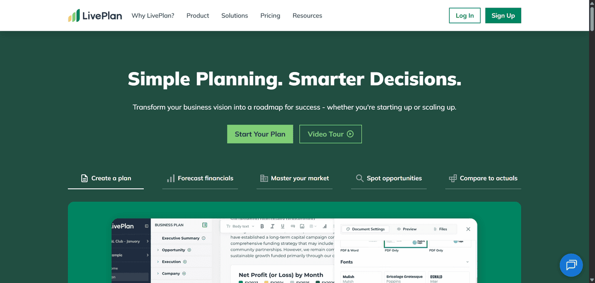 LivePlan is a business planning and financial forecasting platform. Founders use it to build financial models, create business plans, and track performance against targets. It is aimed at early-stage startups that need investor-ready financials but do not have a dedicated finance team.