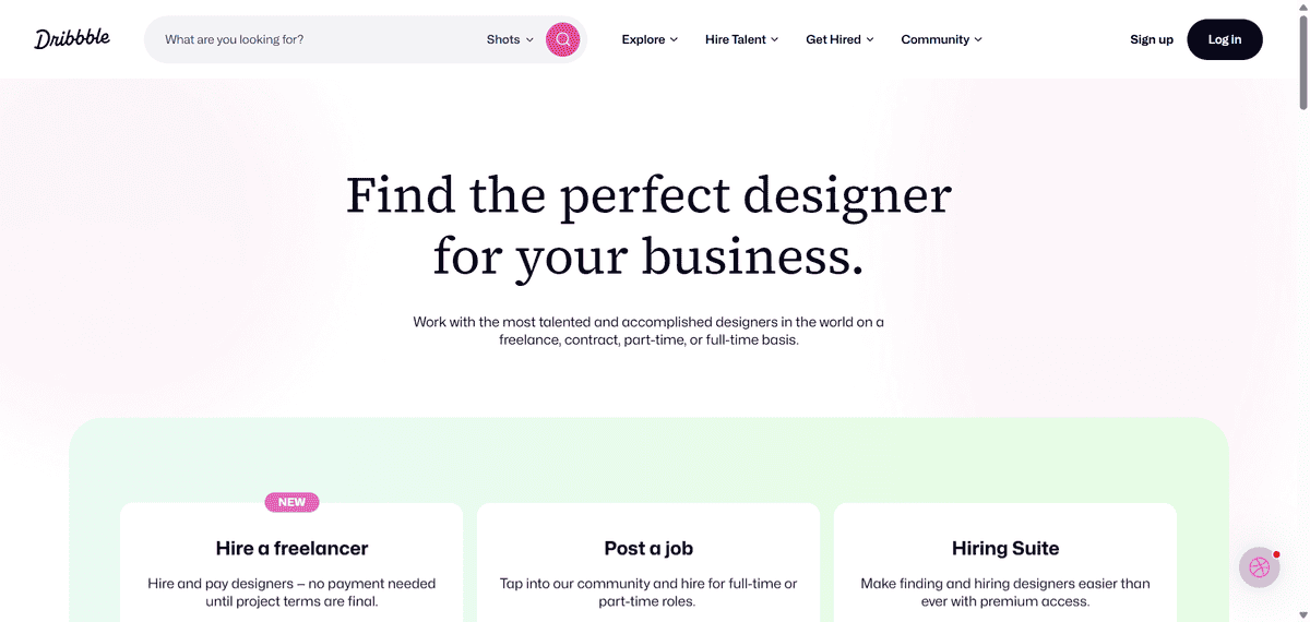 If you want to see what designers can actually do before hiring them, Dribbble Talent gives you that direct portfolio access. It’s a platform where designers showcase their best work, and you can browse through millions of portfolios to find exactly the right talent for your logo project.
