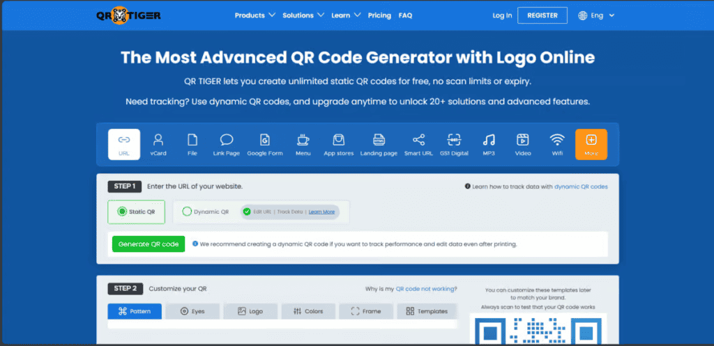 QR Tiger is one of the most advanced QR code generators available, trusted by over 850,000 brands since 2018. If you want QR codes that actually look like your brand rather than generic black-and-white squares, this is the tool to use. You can embed your own logo directly inside the QR code, customise patterns, eye shapes, colours, and frames, and align the entire design with your brand identity.
