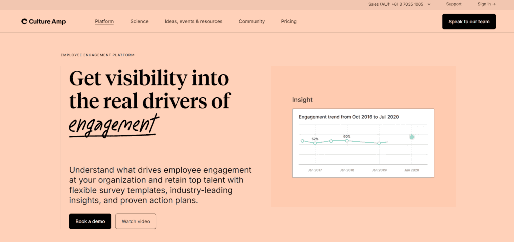 Culture Amp is perfect for companies that need to collect employee feedback to improve their workplace environment and increase employee satisfaction. It offers several surveys and tools specifically designed to understand how employees feel about their jobs, their teams, and the company as a whole. You can use ready-made templates or build your own to fit your company’s unique needs. Once employees fill out these surveys, Culture Amp also helps you make sense of the data with clear reports and actionable insights.