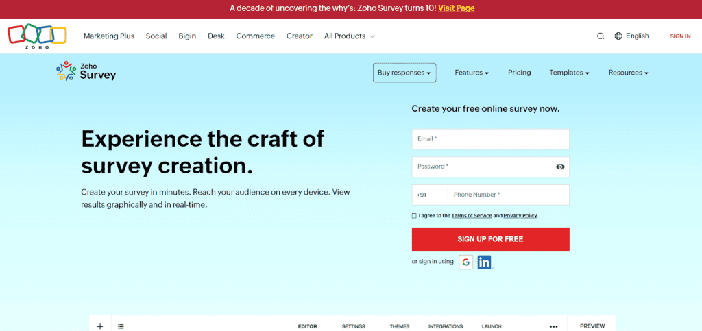 Zoho Survey is the perfect choice for those who want to create surveys quickly and gather customer feedback efficiently. This tool helps you design surveys in minutes, collect responses, and give you actionable insights to improve your business. You can use one of the many customisable templates available on the platform or create your own. It lets you add over 30 different types of questions to your survey like multiple-choice, text boxes, rating scales, and more.