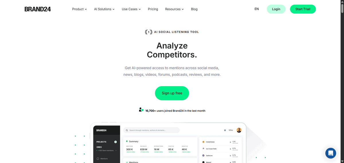 If you’re running a startup and want to know what people are saying about your brand online, Brand24 gives you that real-time insight. It’s an AI-powered social listening tool that tracks mentions of your brand across 270,000+ sources including social media, news sites, blogs, forums, and review platforms.
