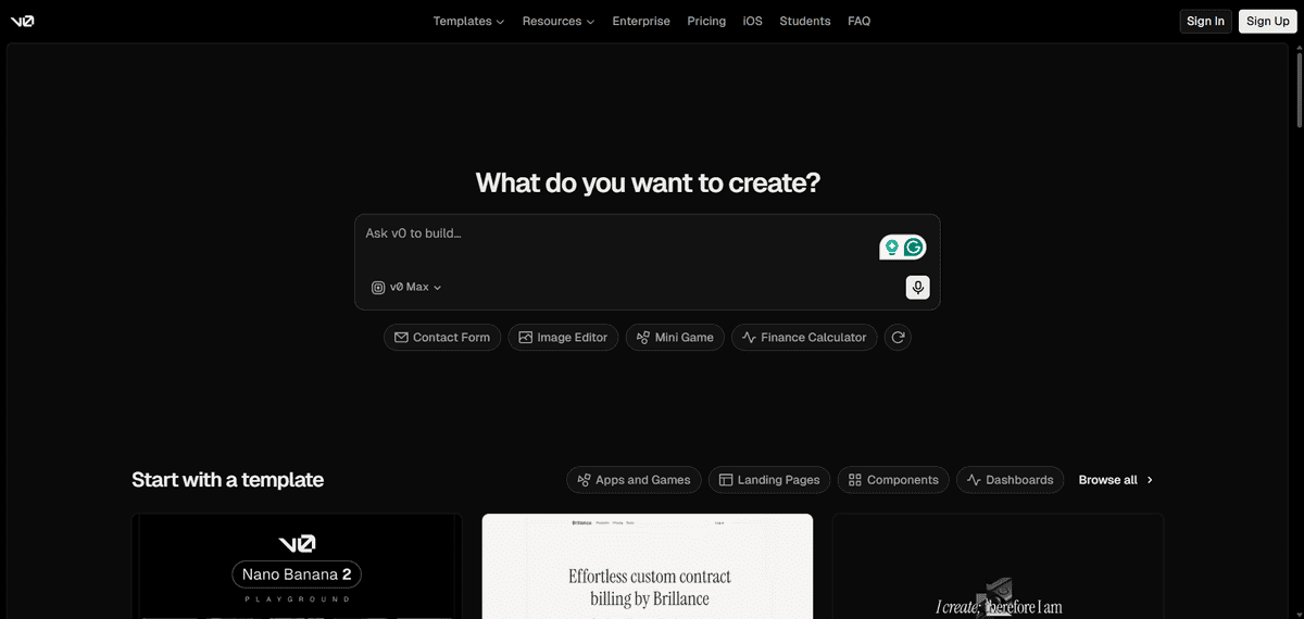 What makes v0.dev different from other AI tools is its focus on generating actual React code that follows modern patterns. v0.dev leverages technologies like Next.js, React, Tailwind CSS, and the shadcn UI component library to create complete, production-ready web interfaces. You’re not just getting a visual mockup – you’re getting real code that works.