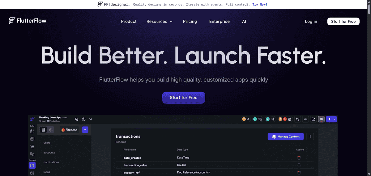 FlutterFlow helps you build apps visually and then export the actual code. You use a drag-and-drop interface to design your app, connect to databases, and set up logic. When you’re ready, you download clean Flutter code that you own completely.