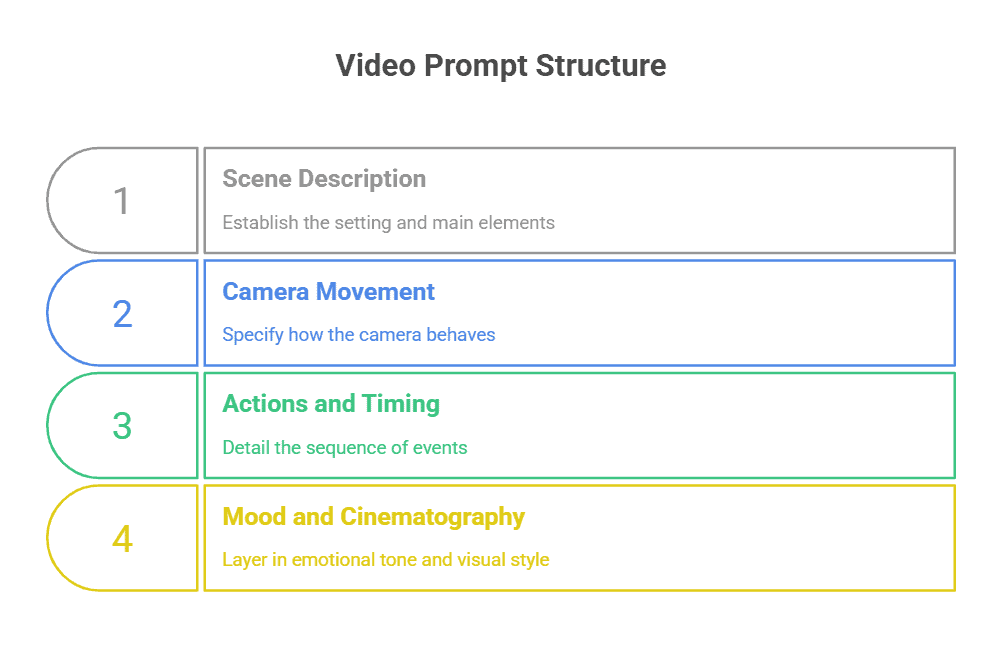 Breaking down video prompts into four core elements helps you think like a director. Each piece controls a different aspect of your scene.