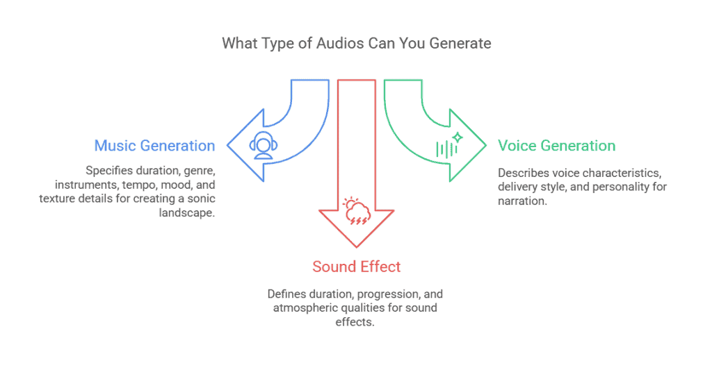 Audio prompts work differently from text or image prompts. You’re describing what something should sound like, not what it should look like. Your prompt needs to capture tempo, tone, instruments, emotional quality, and duration.