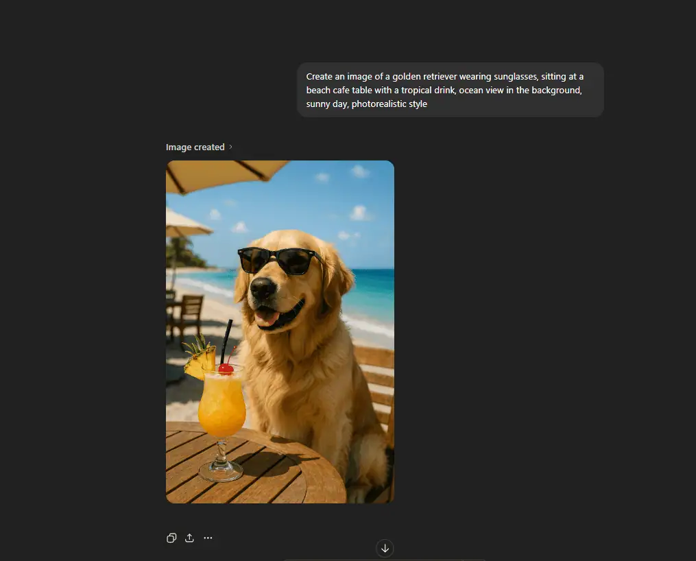 Prompt: “Create an image of a golden retriever wearing sunglasses, sitting at a beach cafe table with a tropical drink, ocean view in the background, sunny day, photorealistic style”