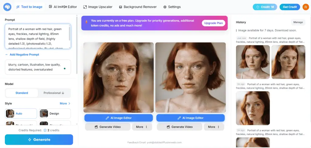 Prompt: “Portrait of a woman with red hair, green eyes, freckles, natural lighting, 85mm lens, shallow depth of field, (highly detailed:1.3), (photorealistic:1.2), professional photography, 8k uhd, sharp focus”