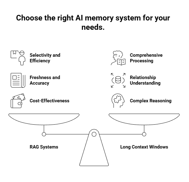 Accuracy differs too. Models can still hallucinate with long context windows, especially when information is scattered across hundreds of pages. RAG systems ground responses in specific retrieved passages, making it easier to trace where information came from and catch potential errors.