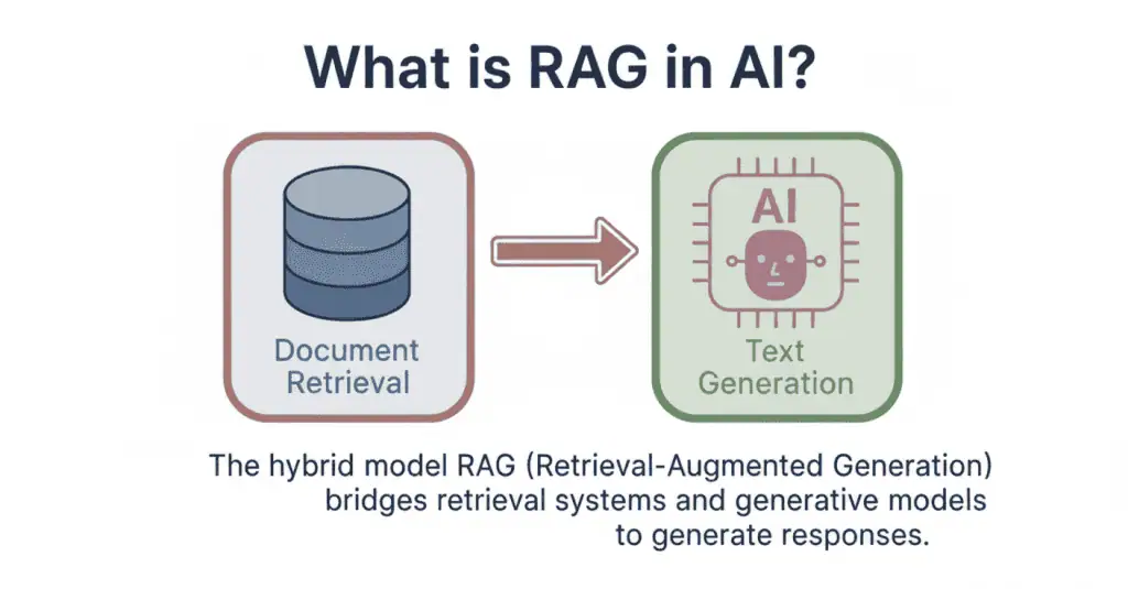 RAG stands for Retrieval-Augmented Generation. It’s a technique that combines two steps: first, the system searches for relevant information from external sources. Then, it uses that retrieved context to generate accurate, grounded responses.
