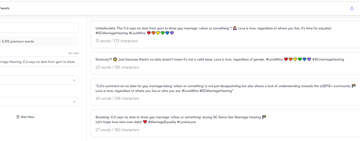 Another template I used from social media templates was the Twitter Tweet template hoping for an option to choose the tone, but unfortunately, that was not available. Despite this, I was pleasantly surprised with the quality of tweets it generated. The tool was able to craft creative and engaging tweets for me.